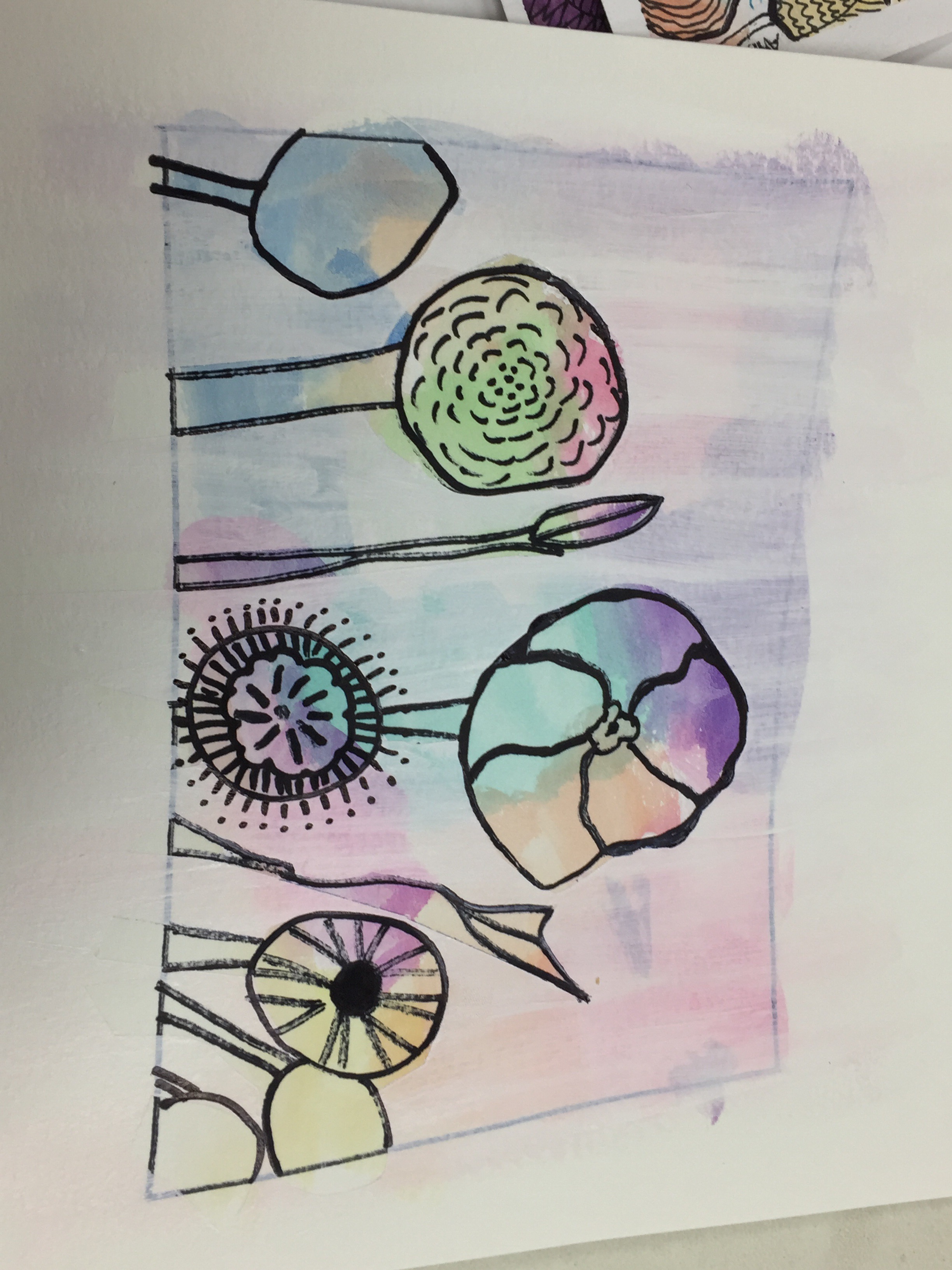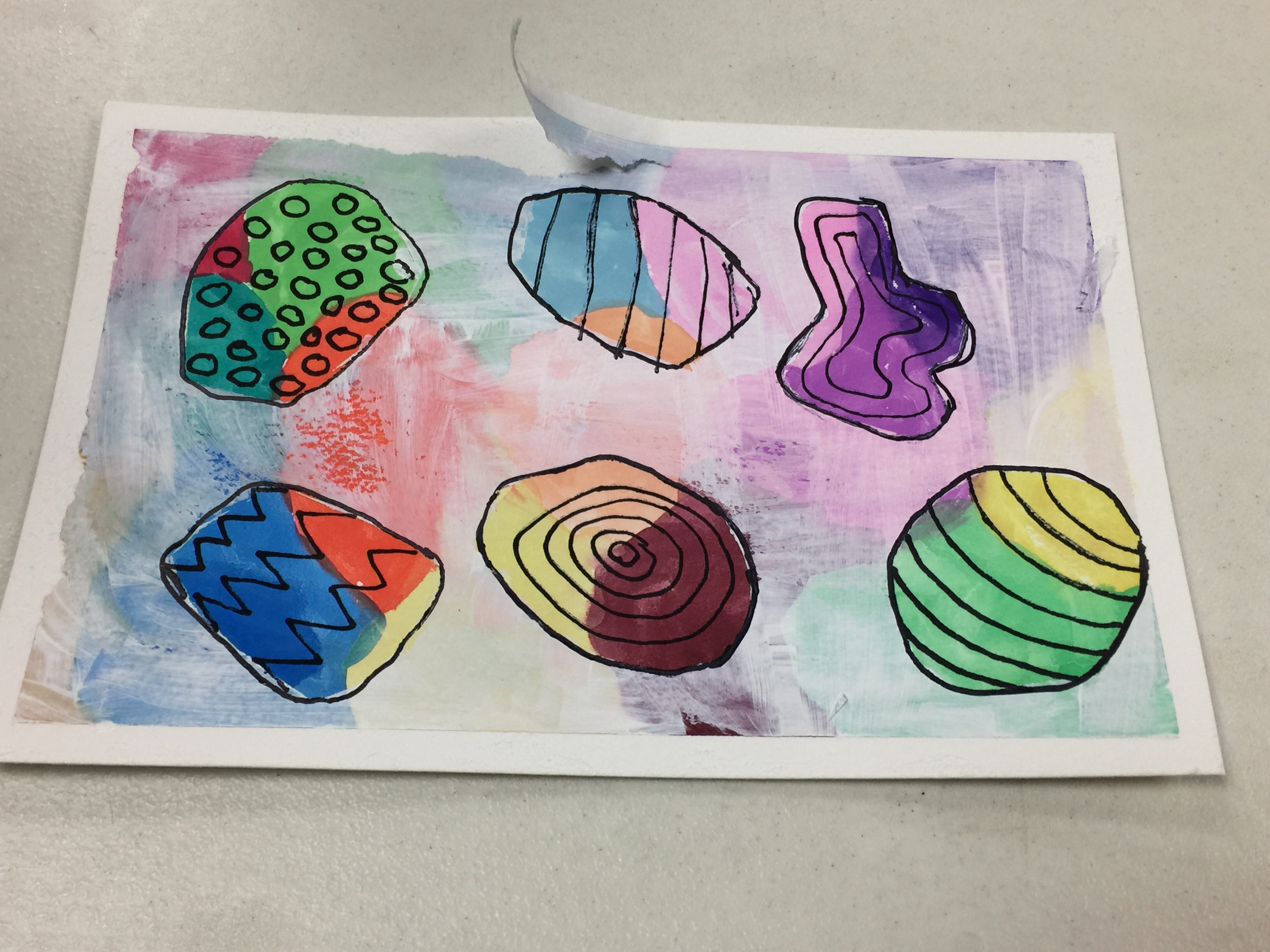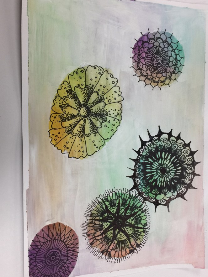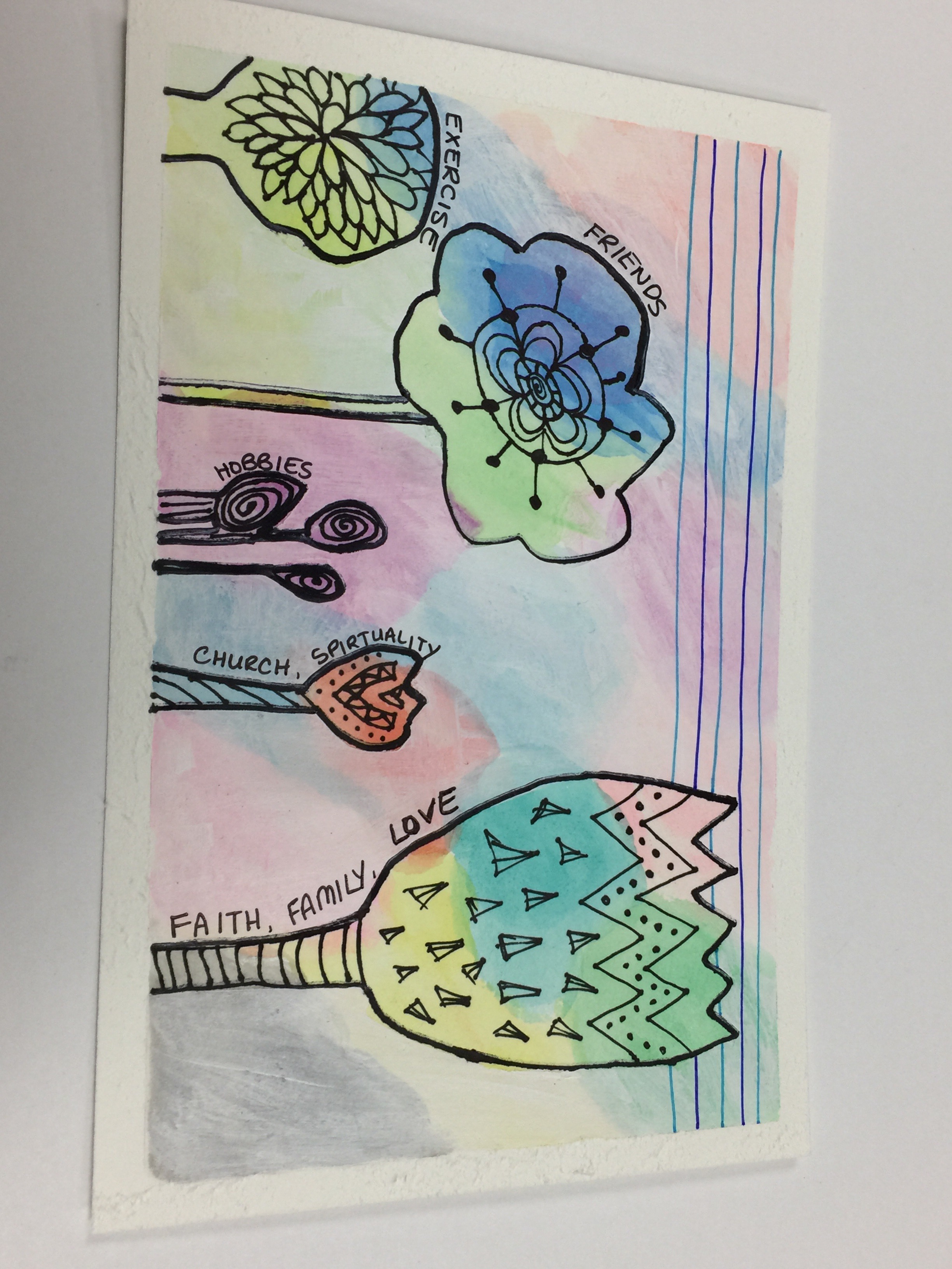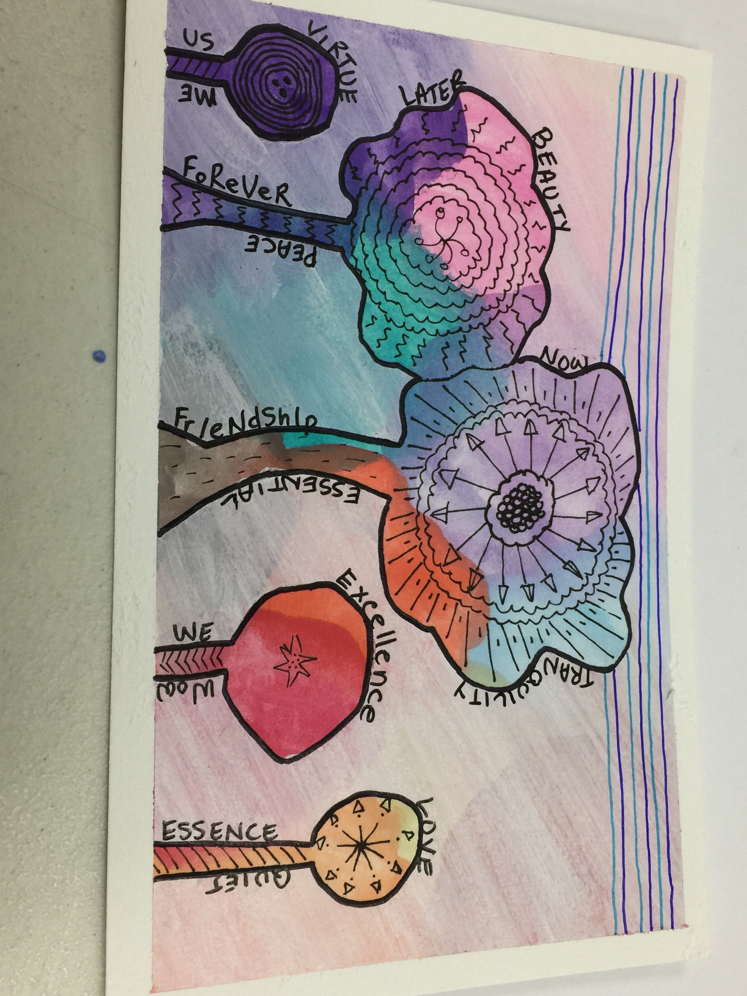 We painted a watercolor background from a vibrant watercolor palette. Cut shapes from the blue painters tape and applied them to our background. We could have made any shape, I happened to like the piece she had made herself and wanted to use the idea. So I made trees. After applying the tape stencils we painted over the entire piece with white acrylic paint. Once that was dried, we pulled the stencils off. WOW did it look different! We were then instructed to add dimension and detail to the piece with black marker. Kind of like doing zentangles (in case you have no idea what a zentangle is, here is a link zentangle).