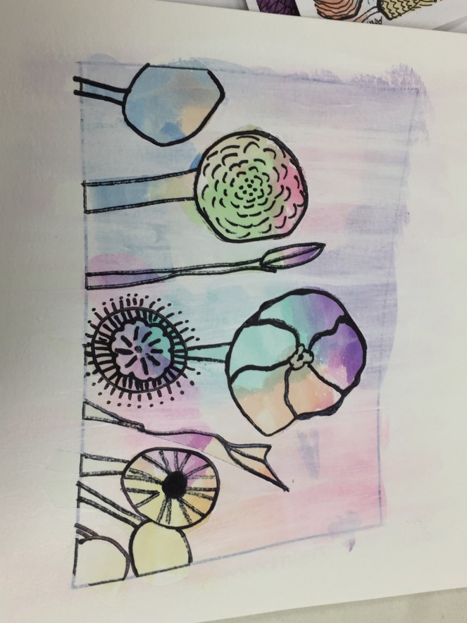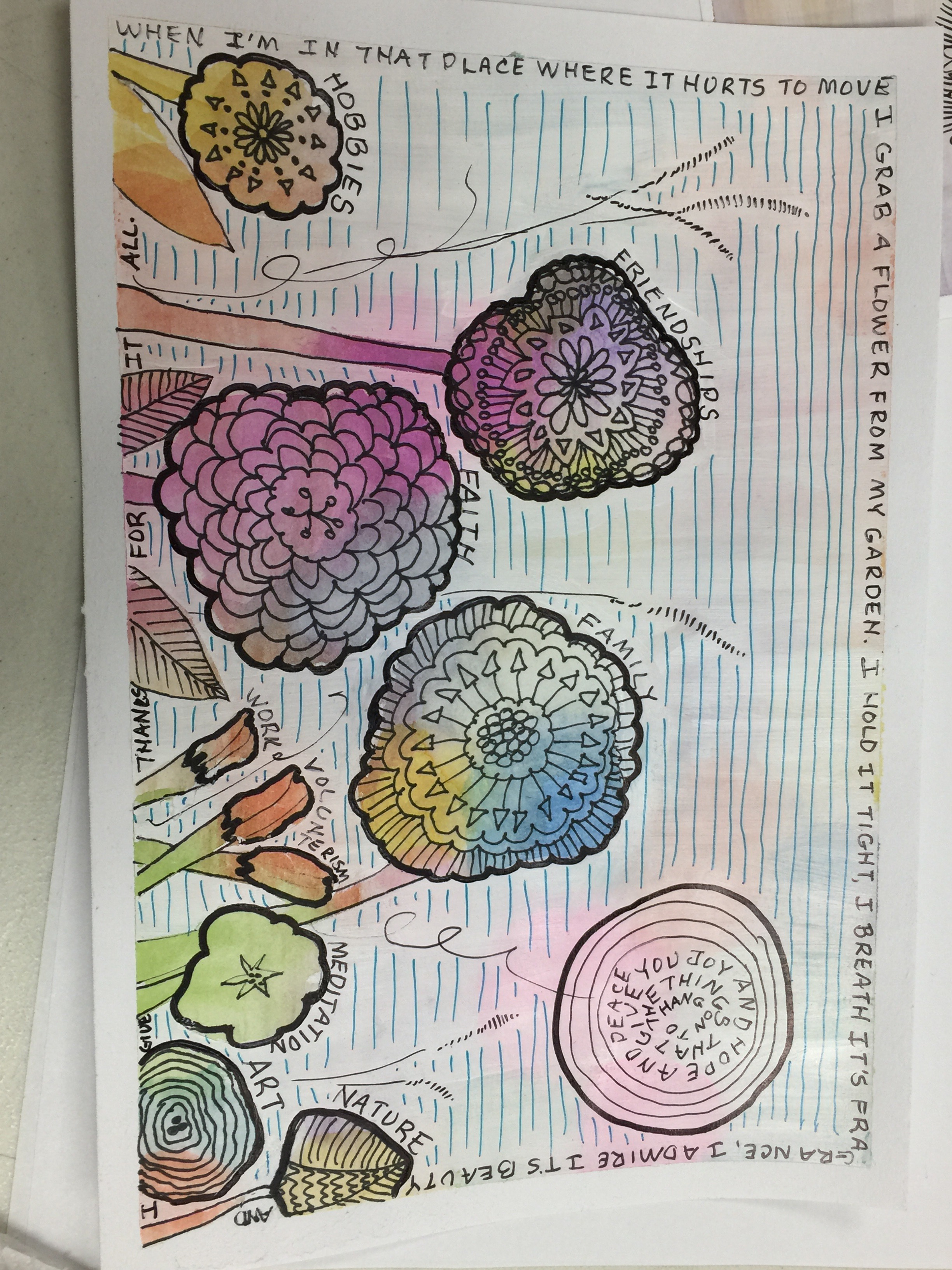 Such a beautiful idea and what a work of art! Why don’t we all try to do this very thing this week and post what we come up with. Mine is up top, what does yours look like? Below, I have added the works of the other gals in the class. Sorry that I cannot remember exactly who’s is who’s. Will be posting again soon, happy journaling!